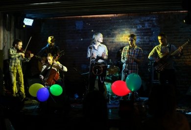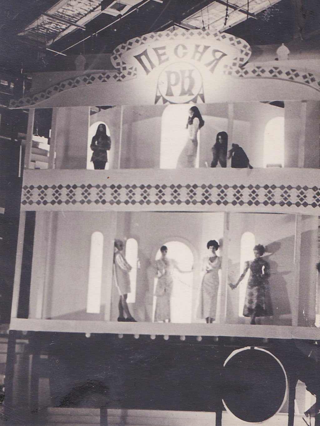 На фота: Уладзімер Арлоў, манэкеншчыцы і «Песьняры»