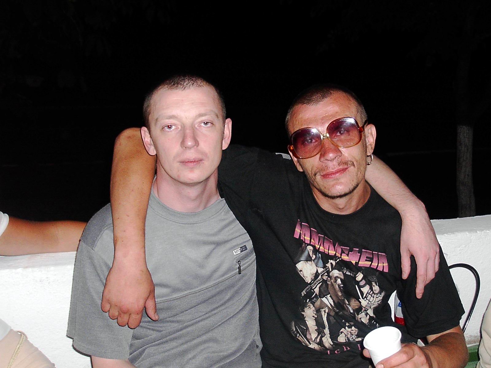 2002. «Гэта мы перад канцэртам сядзім на лаўцы зь Юрам каля ўваходу ў клюб „Графіці“», — кажа пра наступнае фота Аляксандар, вылучыўшы яго зь іншых фотаздымкаў гэтага году.