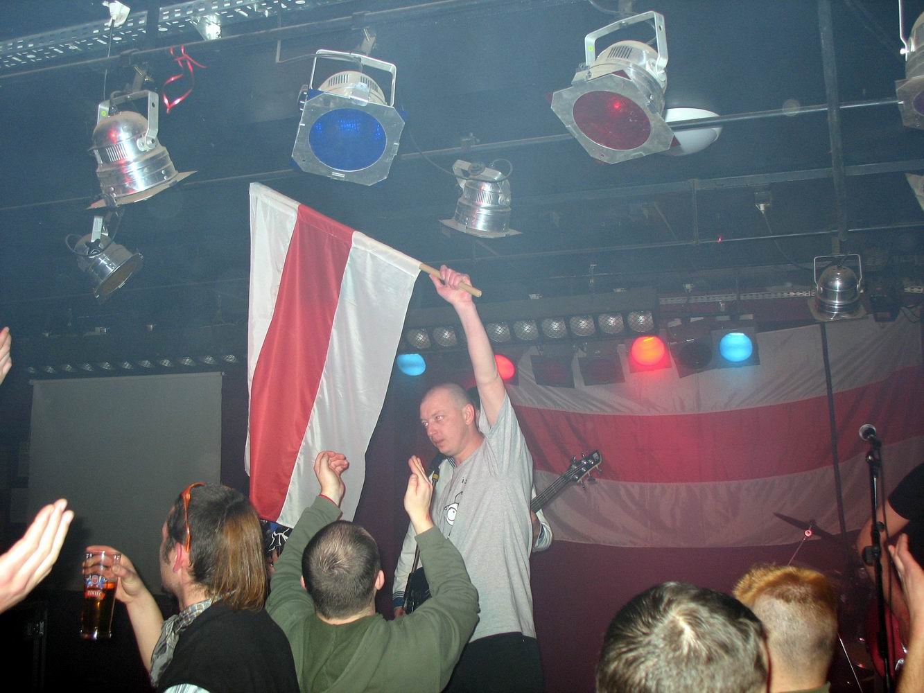 2009. Алег Хаменка віншуе Neuro Dubel з 20-годзьдзем. Фота зроблена ў клюбе «Рэактар» падчас юбілейнага концерту.