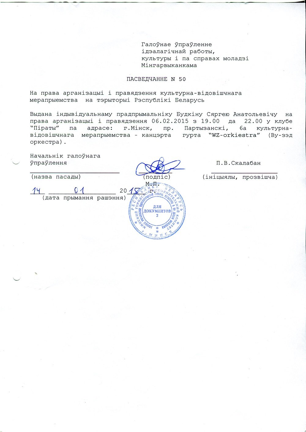 Сябры! З свайго боку мы зрабілі ўсё магчымае, каб канцэрт WZ-orkiestra адбыўся ў прызначаны дзень, у прызначаны час і ў прызначаным месцы. На правядзеньне дадзенага канцэрту было атрыманае гастрольнае пасьведчаньне №50 ад 14.01.2015 ад галоўнага ўпраўленьня ідэалягічнай работы, культуры і па справах моладзі Менгарвыканкаму. З клюбам «Піраты» — ТАА «Арт Арміс» — была заключаная дамова аказаньня паслугаў ад 5.01.2015 (далей — Дамова). Пасьля атрыманьня гастрольнага пасьведчаньня была распачатая рэклямная кампанія і рэалізацыя квіткоў праз апэратара Kvitki.by.