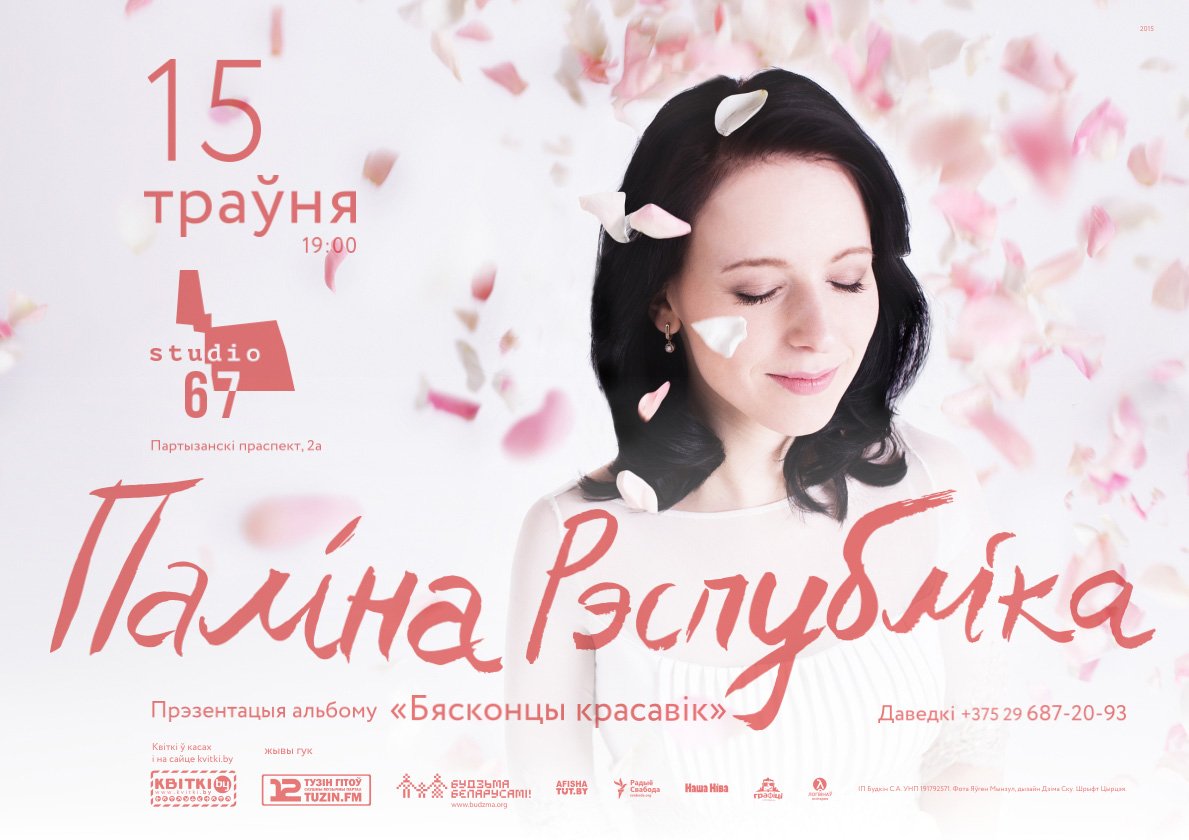 15.05.2015. 19:00. Паліна Рэспубліка. Прэзэнтацыя альбому «Бясконцы красавік». Месца: Studio 67 (прасп. Партызанскі, 2а). Квіткі ў касах і он-лайн у апэратара Kvitki.by. Кошт — 200 000 руб. (папярэдне). Інфалінія — +375 29 687-20-93.
