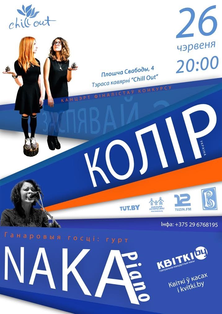 26 чэрвеня на тэрасе кавярні Chill-Out на плошчы Свабоды выступіць фіналіст конкурсу «Засьпявай 2.0» «Колір» з Адэсы, а падтрымае іх сваім выступам Naka. Канцэрт пройдзе ў фармаце «piano».