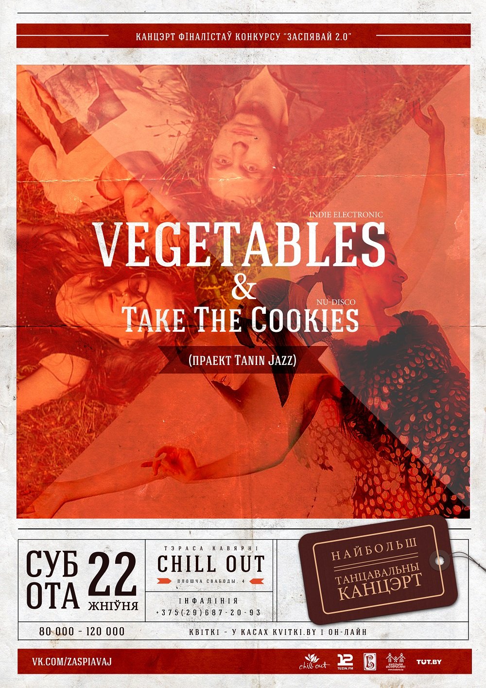 22.08 (субота). 20:00. Тэраса кавярні Chill-Out (плошча Свабоды, 4). Vegetables і Take the Cookies (праект Tanin Jazz). Квіткі — у касах Kvitki.by і он-лайн. Кошт: 80 000 — 120 000. Інфалінія: +375-29-687-20-93.