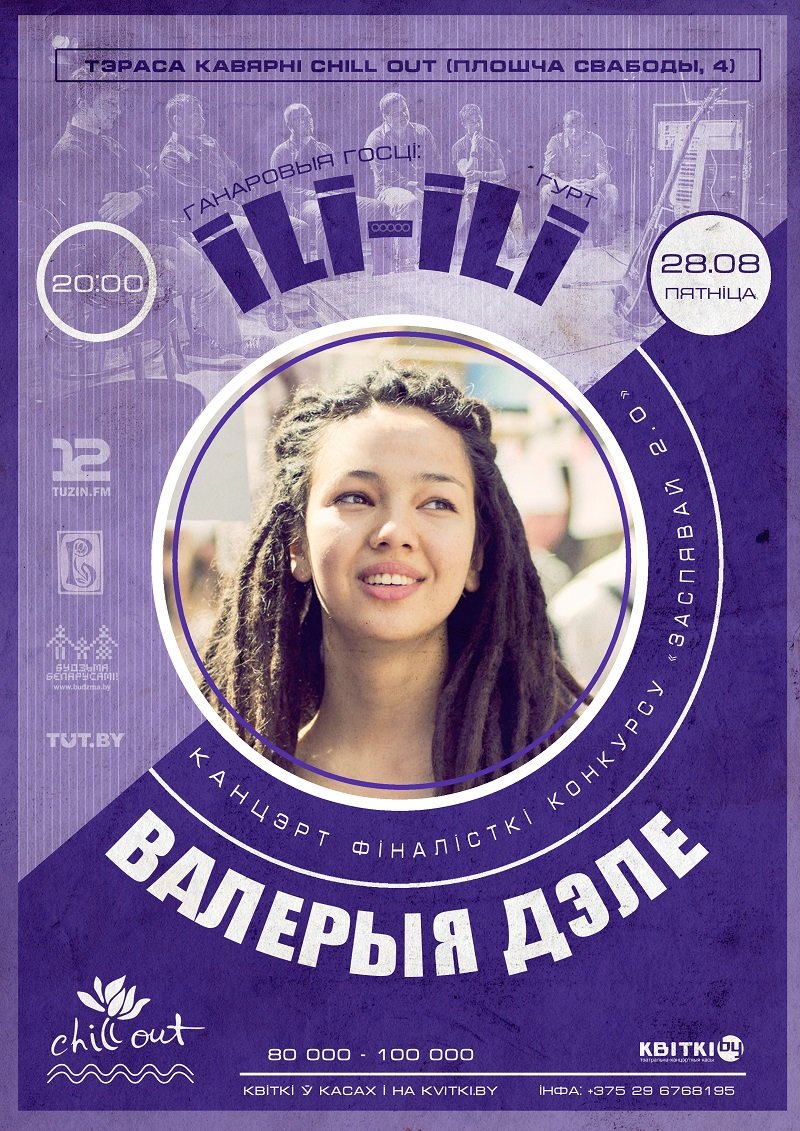 28.08. 20:00. Тэраса кавярні Chill-Out (плошча Свабоды, 4). Валерыя Дэле і гурт ili-ili. Квіткі — у касах Kvitki.by і он-лайн. Кошт: 60 000 — 80 000 (папярэдне), 100 000 (у дзень, пры наяўнасьці). Інфалінія: +375-29-676-81-95.