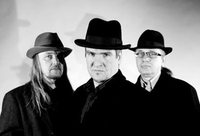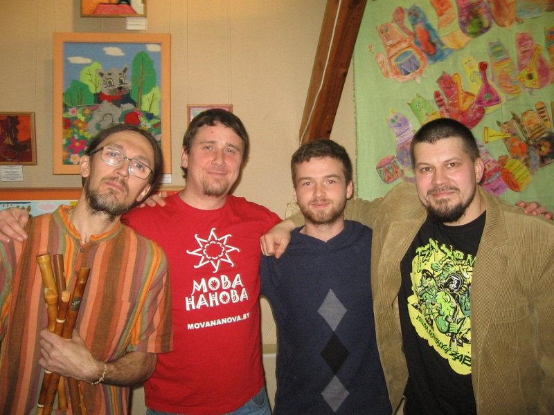 На фота зьлева направа: Васіль «Хіпар» Валошчык з гурта «Людзі на балоце», Сяргей Маркаў вядучы курсаў «Мова Нанова» ў Віцебску, Стась Сілка і Алесь Дзянісаў, фота з асабістага архіву Алеся Дзянісава