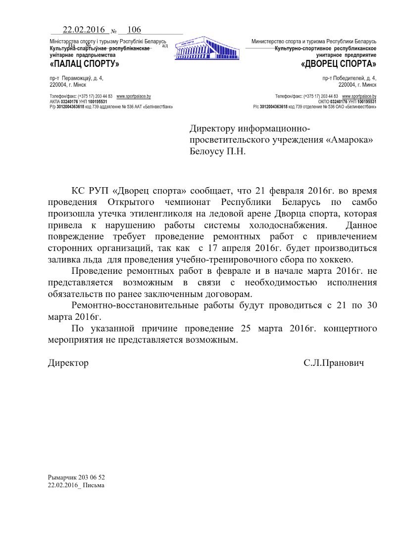 Выйшла спадзяванка — харошыя людзі захацелі зладзіць сапраўднае беларускае сьвята на дзень беларускай дзяржаўнасьці, улады ім адмовілі. Дробязі і дэталі могуць трошкі зьдзівіць — канцэрт з гэтай нагоды меркавалася правесьці 25 сакавіка ў Палацы спорту з удзелам найлепшых музыкаў краіны. Пад ідэю падпісаліся Лявон Вольскі, «Крамбамбуля», Dzieciuki, Akute, Vinsent, «Крама», Trubetskoy, Vuraj, :B:N:, Amaroka, РСП, «Мутнаевока», «Амплітуда сьмеласьці». Дырэктар пляцоўкі Сяргей Прановіч быў ня супраць, грошы на арганізацыю меліся, але ўмяшалася трэцяя сіла — этыленгліколь. Таксічнае рэчыва, трапляньне якога ў арганізм можа прывесьці да непапраўнага, наступствы такія, што пагроза сьмерці. Рэчыва пратачылася падчас правядзеньня чэмпіянату Беларусі па самба акурат за дзень, калі гарадзкім уладам трэба было даць адказ наконт заявы аб правядзеньні мерапрыемства. Ліквідаваць праблему будуць якраз пасярод сакавіка, кажуць у аргумэнтацыі адмовы прадстаўнікі ўлады. Іншыя сакавіцкія канцэрты на гэтай пляцоўцы не адмененыя. У сеціве жартуюць: трэба папярэдзіць фанатаў Стаса Міхайлава, у якога канцэрт у Палацы спорту 7 сакавіка. Яшчэ ў пэрыяд уцечкі атрутнага рэчыва да рамонтных працаў тут выступяць сусьветныя зоркі The Gregorian (8.03) i The Hurts (12.03), а таксама будзе паказаны рок-м’юзыкал «The Todd» (11.03). Крэатыў чыноўнікаў з этыленгліколем выглядае сьмешна — фармальна яны сьвядома труцяць гледачоў гэтых мерапрыемстваў.