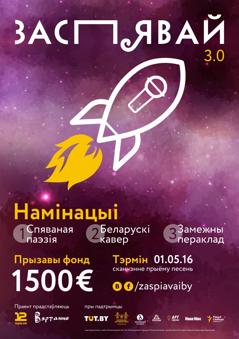 Партал tuzin.byculture.org і фонд «Вяртаньне» пры падтрымцы TUT.BY абвяшчаюць трэці сэзон конкурсу маладых выканаўцаў «Засьпявай.BY». Узроставы цэнз падвышаецца да 33 гадоў, намінацыяў становіцца болей, прызавы фонд павялічваецца да 1500 эўра.