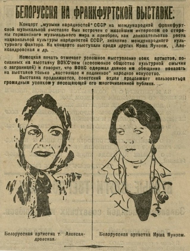 3. Загадчык Белдзяржкіно Абрам Галкін у 1927 годзе паведамляў: «Адна з найбуйнейшых нямецкіх фірмаў „Фэбус-фільм“ прапанавала рабіць сумесныя здымкі». А беларускія сьпявачкі Ларыса Александроўкая й Ірма Яўнзэм выступілі на Міжнароднай музычнай выставе ў Франкфурце, дзе ў дадатак дэманстравалася калекцыя беларускіх народных інструмэнтаў.